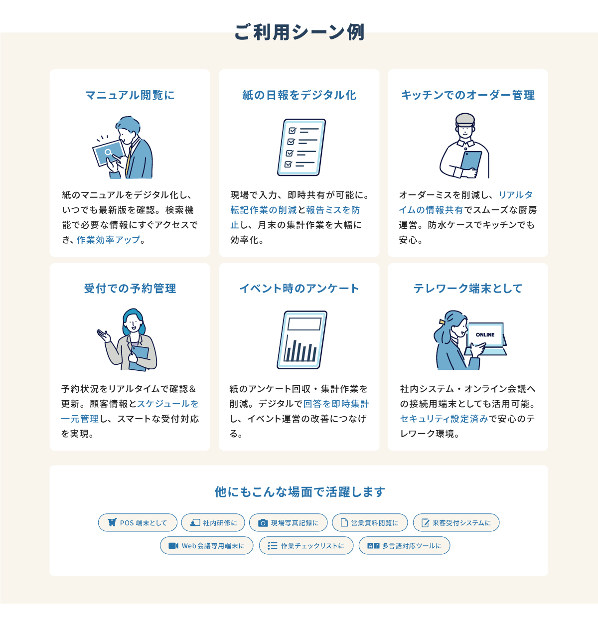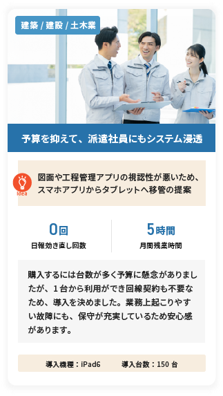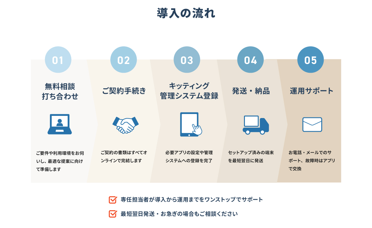 ヒアリングから設定・納品・サポートまで一貫対応 あなたの現場にも最適なモバイル端末をご提案します 専門担当があなたの現場に最適なタブレットをご提案します 事務手数料3,300円→無料キャンペーン中