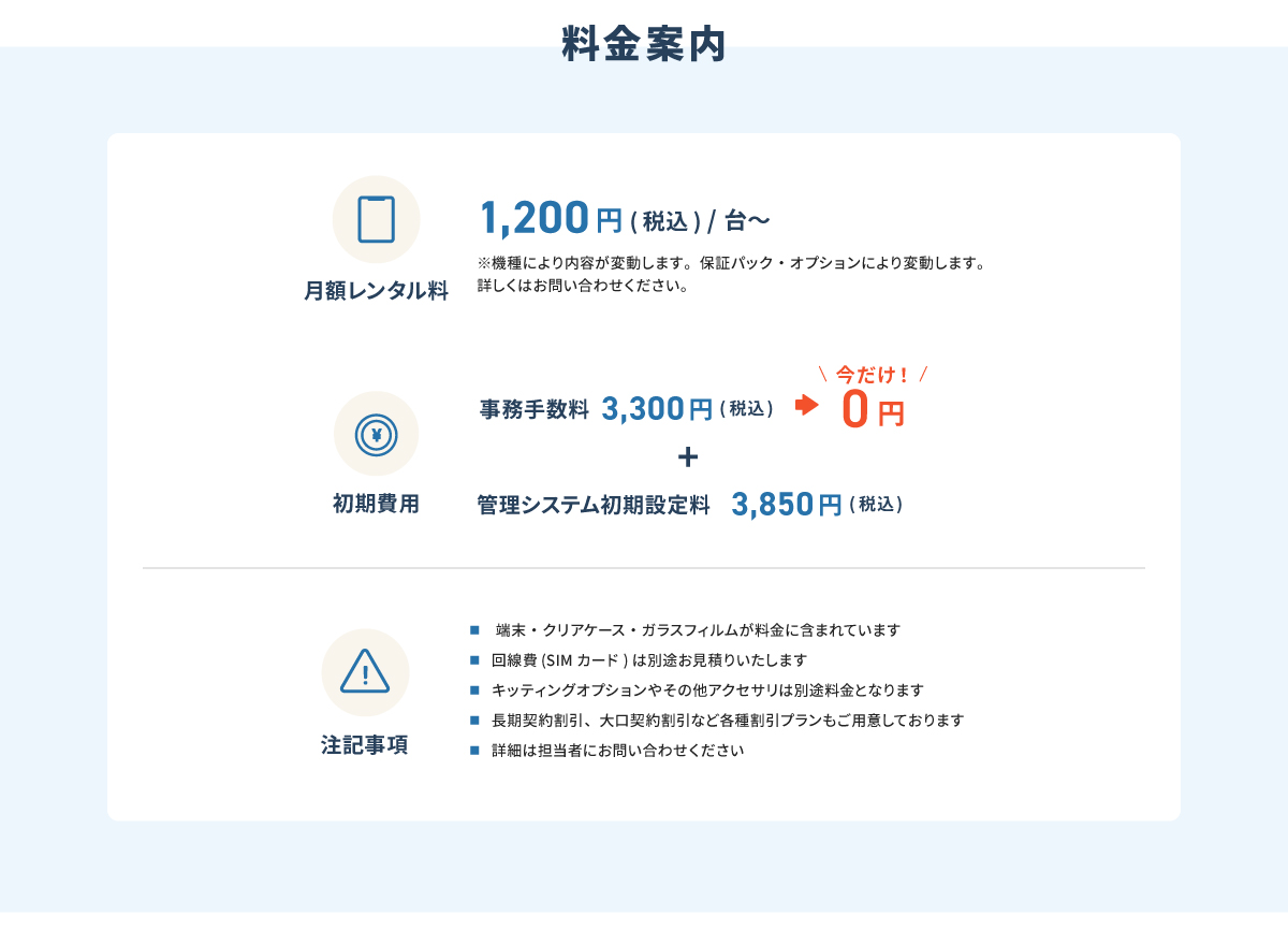ヒアリングから設定・納品・サポートまで一貫対応 あなたの現場にも最適なモバイル端末をご提案します 専門担当があなたの現場に最適なタブレットをご提案します 事務手数料3,300円→無料キャンペーン中